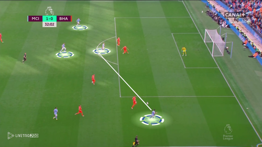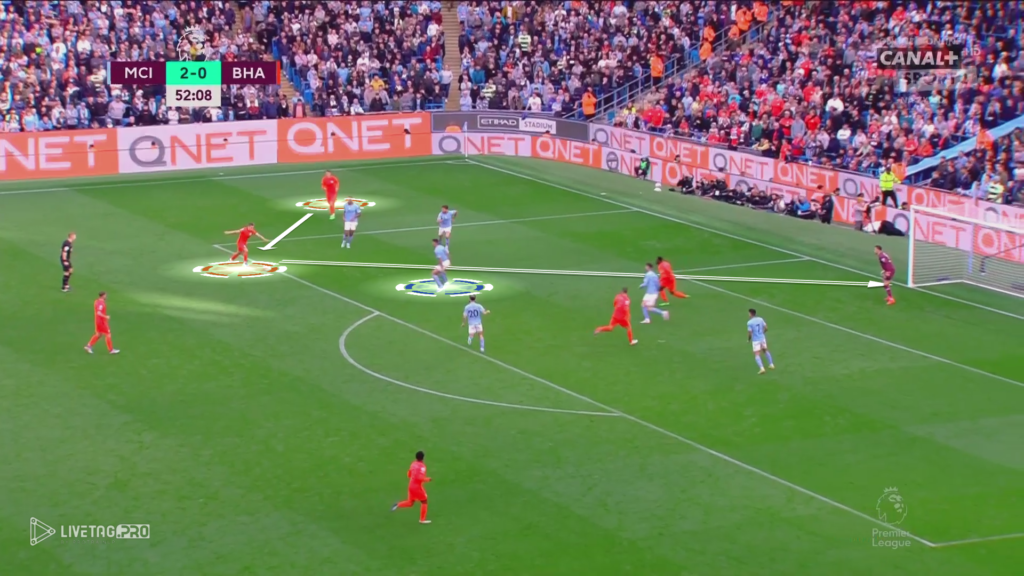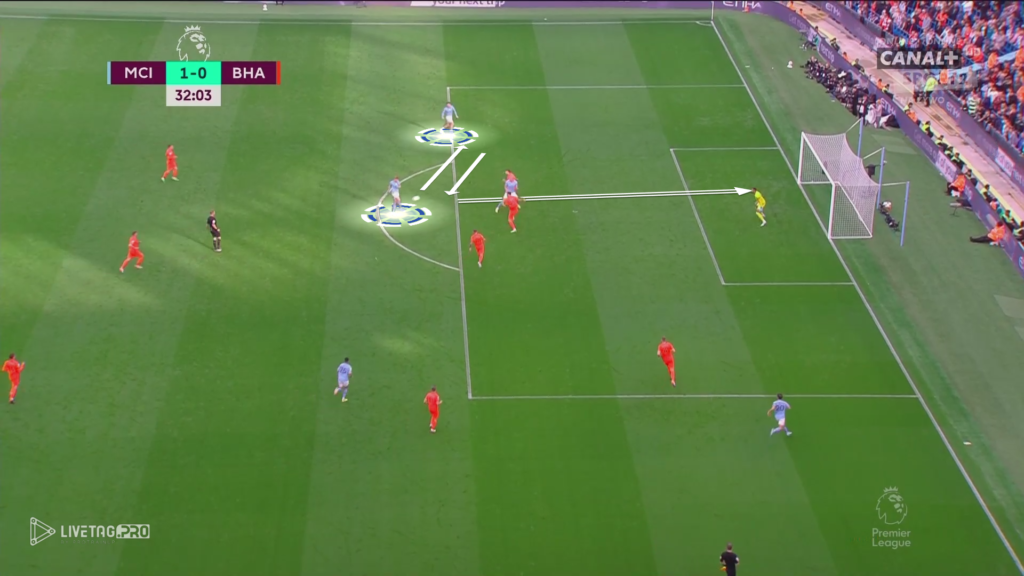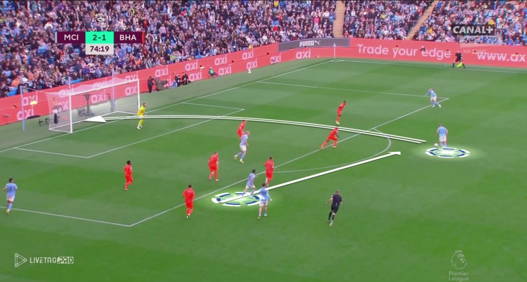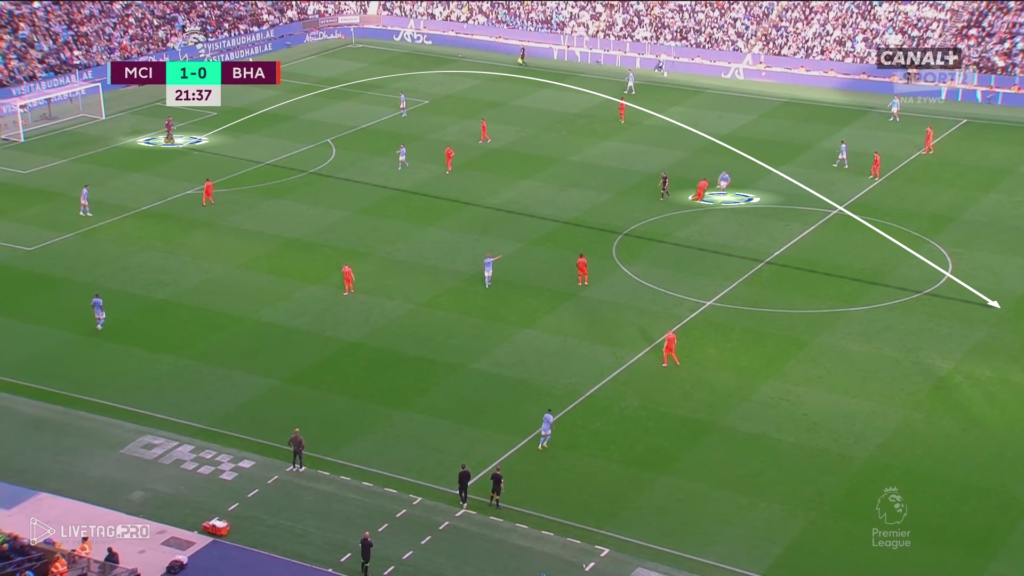 W myśl zasad Pepa Guardioli +1 w fazie budowy w pierwszej strefie oraz strefie wysokiej, mamy przykład ataku szybkiego City. Wypełnienie pola karnego przez City oraz mała gra KDB, jak i Grealish przy słabej organizacji w fazie przejścia Brighton mógł spowodować utratę kolejnej bramki przez zespół De Zerbiego.