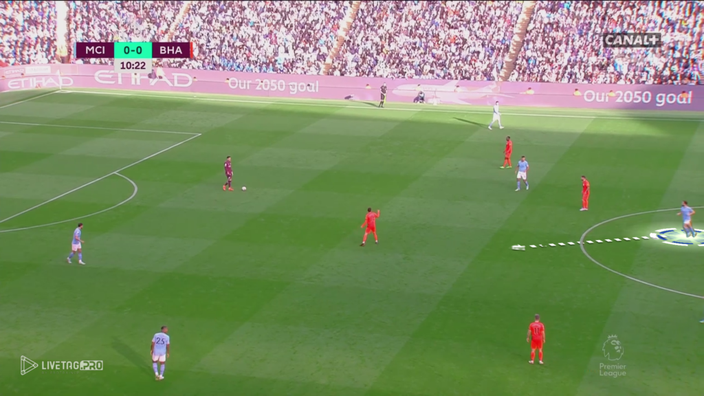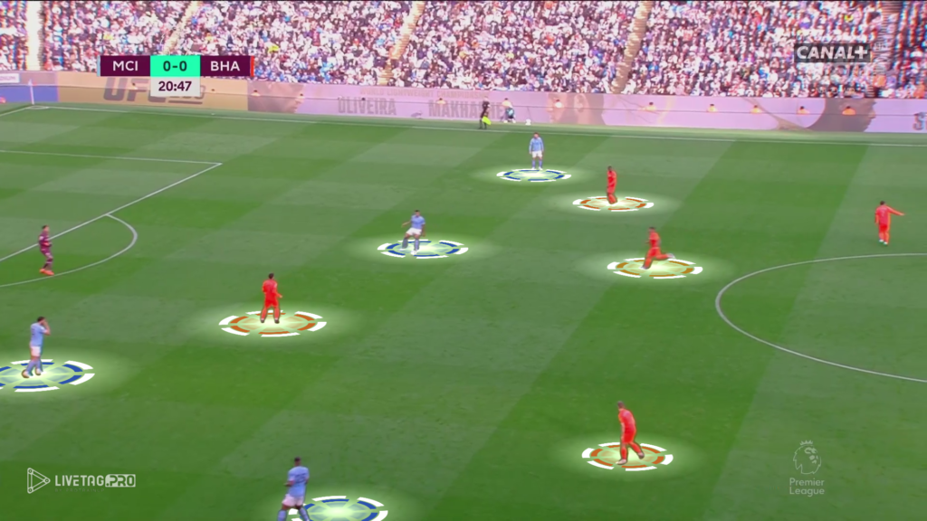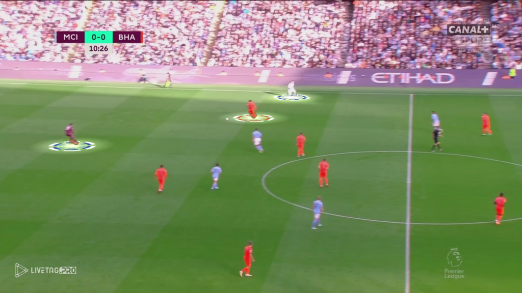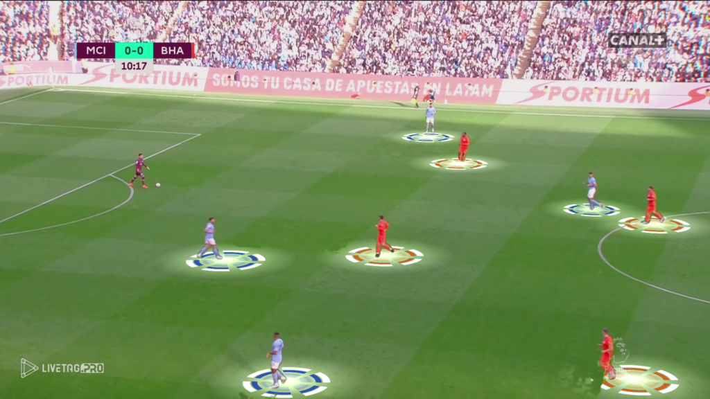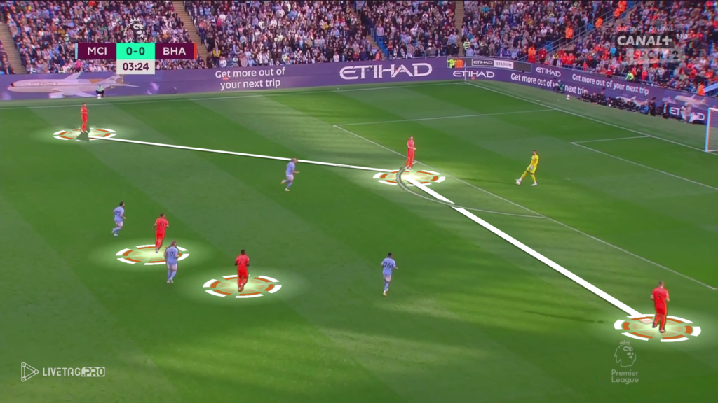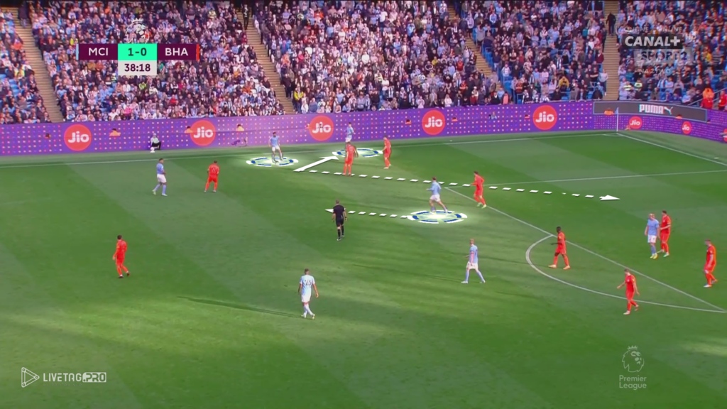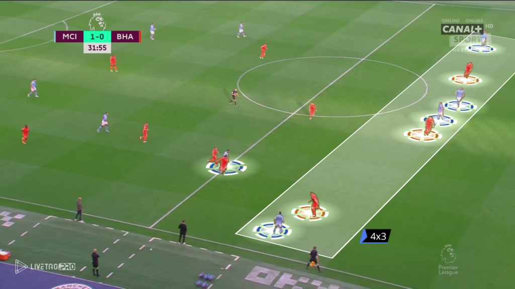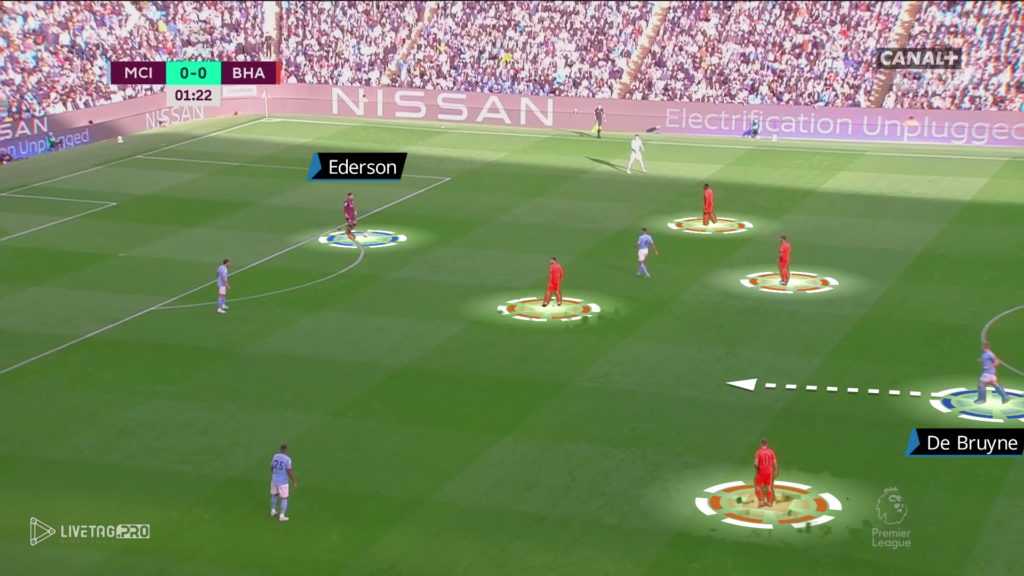 Od początku meczu Brighton miało w planie wyjść pressingiem wysokim z intencją krycia indywidualnego na całym boisku. Manchester City, który skutecznie wykorzystuje Edersona do przewagi (11×10) oraz zejście jednego z zawodników na własną połowę tworzyło przewagę liczebną oraz miejsce pomiędzy formacjami Brighton.