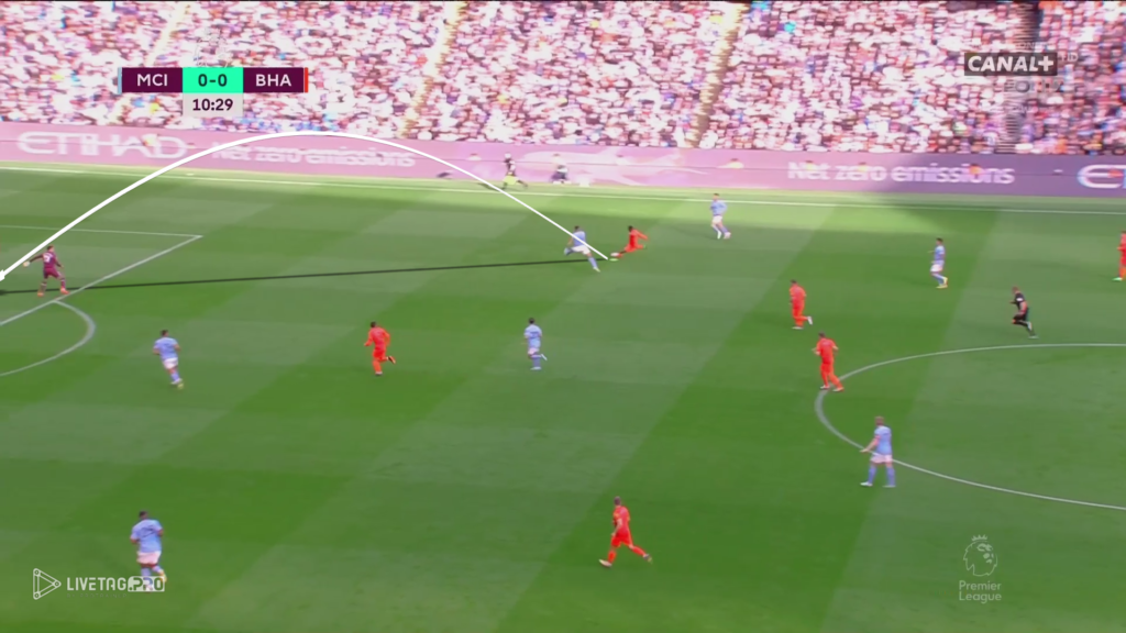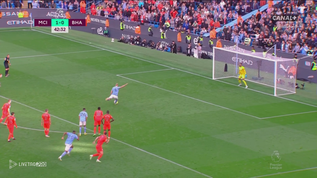 Pierwsza bramka dla Manchesteru City padła po skutecznej realizacji założeń meczowych. Podczas krycia 1×1 przez Brighton na całym boisku, działania, które opisywałem wyżej skutecznie doprowadziły do pierwszego gola w meczu. Tworzenie przestrzeni przez Haalanda, wykorzystanie w grze Edersona, jako zawodnika +1 w budowaniu i bardzo dobre podanie w wolną przestrzeń.