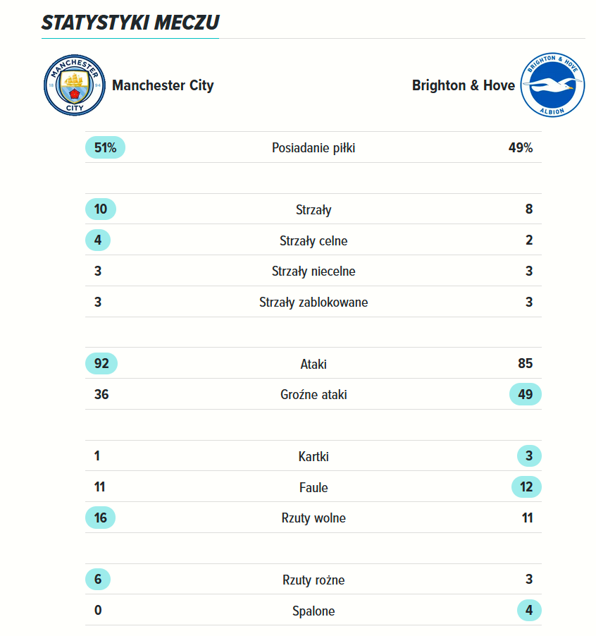 Mecz zwycięża drużyna Manchesteru City 3:1 w meczu z Brighton.