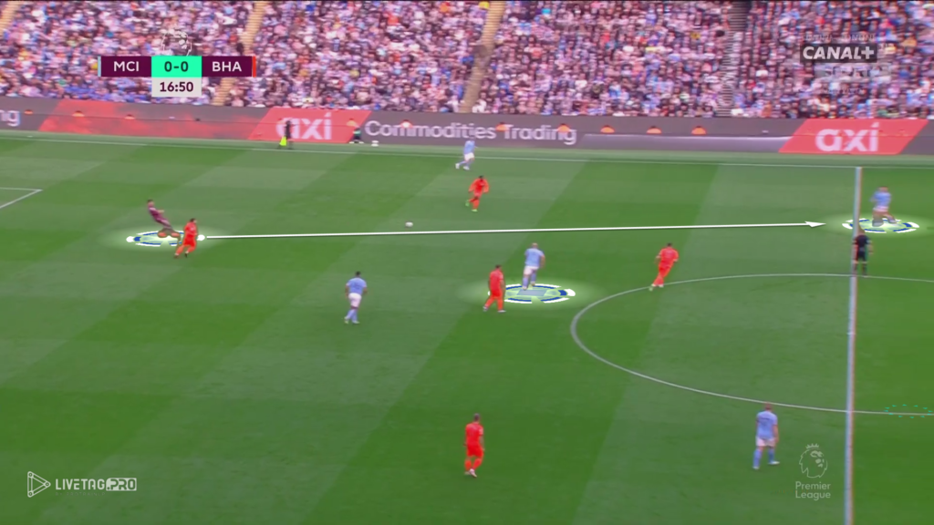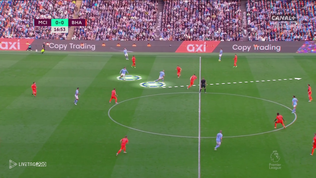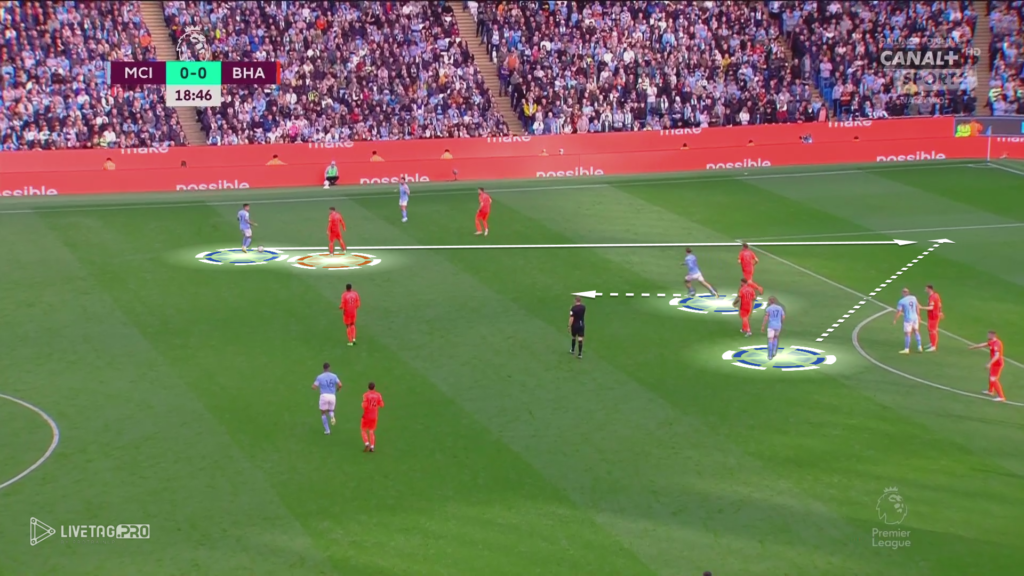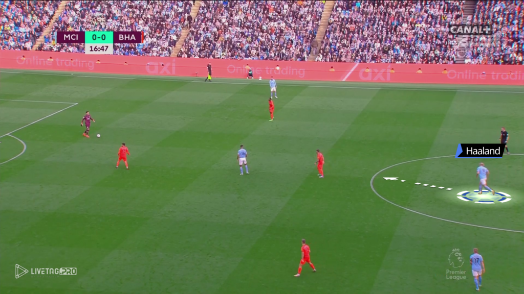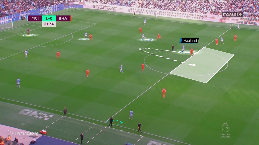 Bardzo ciekawym pomysłem na grę City było zejście Haalanda w przestrzenie niskie, gdzie jego ruchy wyciągały obrońców Brighton. Takie poruszanie się Norwega tworzyło przestrzeń za plecami rywali, którą w 16 minucie meczu mógł wykorzystać Bernardo Silva, który otrzymał bardzo dobre podanie od Edersona, jednak nie skierował on podania do wbiegającego Haalanda.