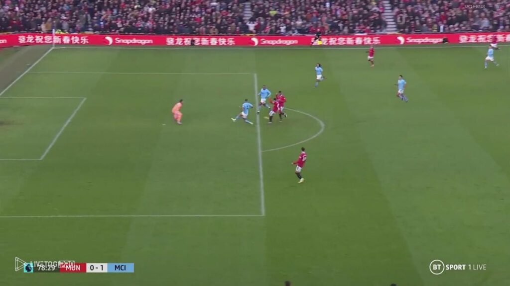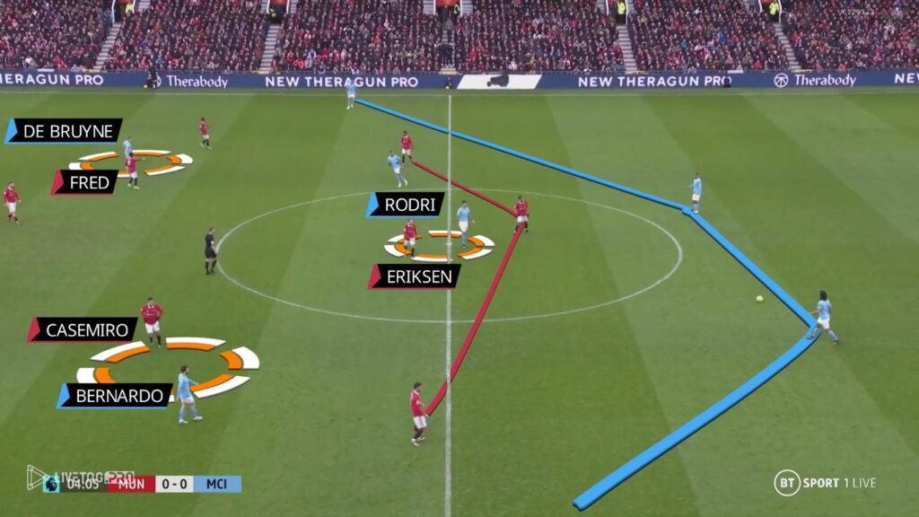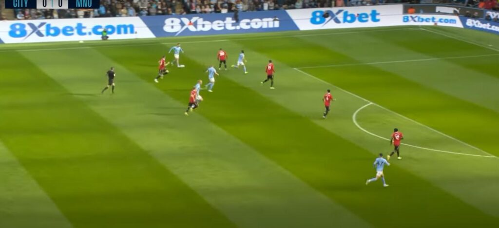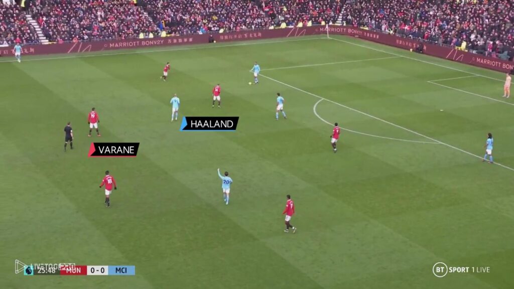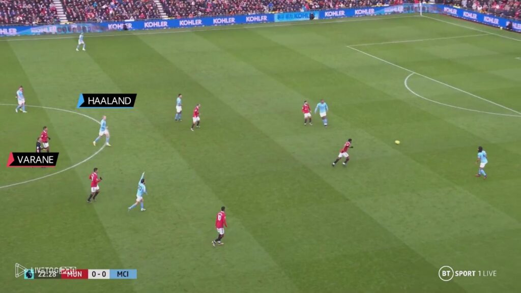 Schodzący nisko po piłkę Haaland, chciał pociągnąć za sobą jedną z „szóstek” United co stworzyłoby miejsce dla KDB oraz Bernardo. Casemiro oraz Fred pozostawali jednak dalej odpowiedzialni indywidualnie za 8/10 Manchesteru City, a za wychodzącym Haalandem podążał do końca jeden z dwójki środkowych obrońców (Varane/Shaw) wiedząc, że zwolnioną za nim przestrzeń zaasekurują „szóstki”.
