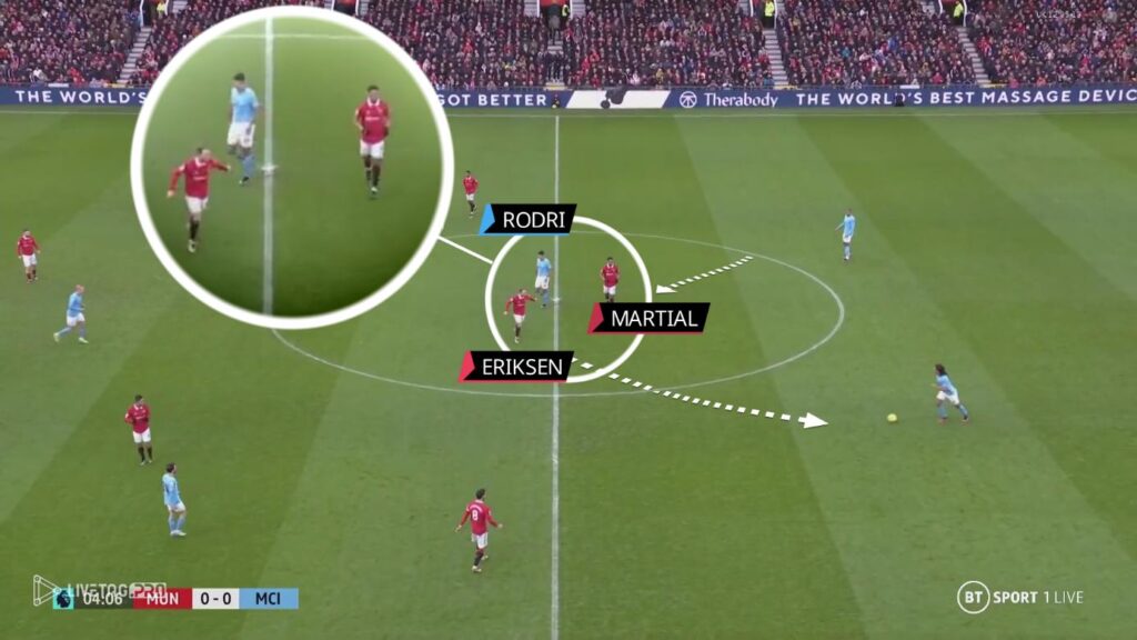 Jedynym momentem kiedy udało się przeszyć pierwszą linię pressingu Czerwonych Diabłów, było zejście Rodriego lub Bernardo między dwójkę środkowych obrońców i wejście Walkera w linię pomocy jako fałszywa „szóstka”. Działo się to jednak stosunkowo rzadko, ponieważ przez większość meczu skrzydłowi skutecznie zamykali podania w środek między sobą, a napastnikiem.