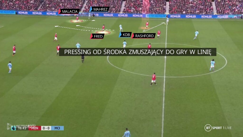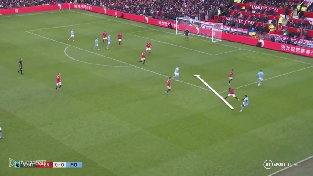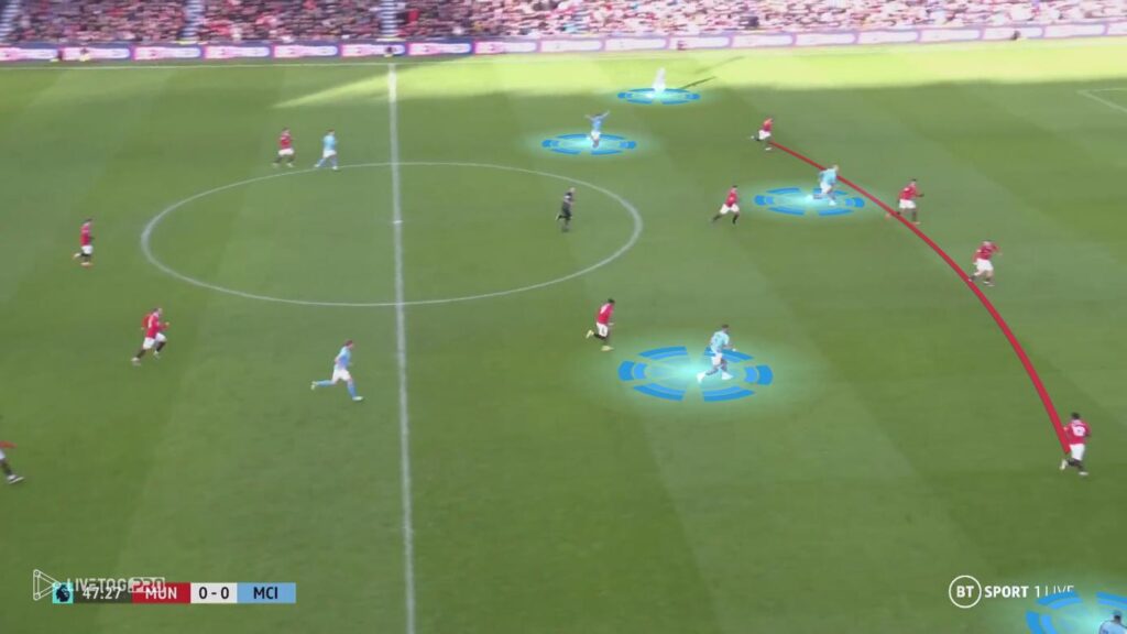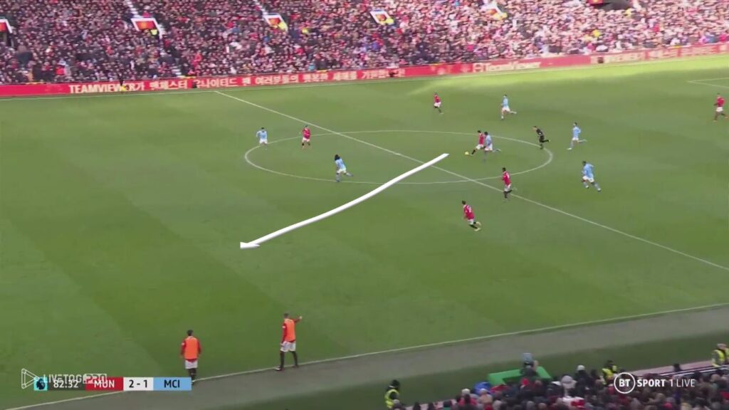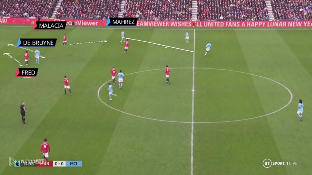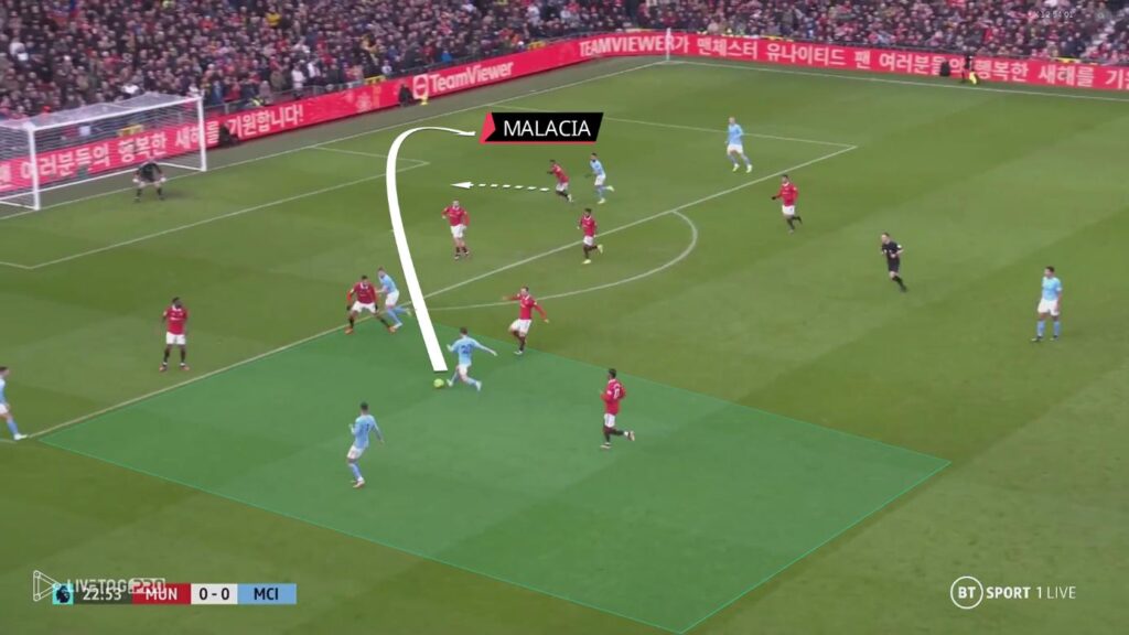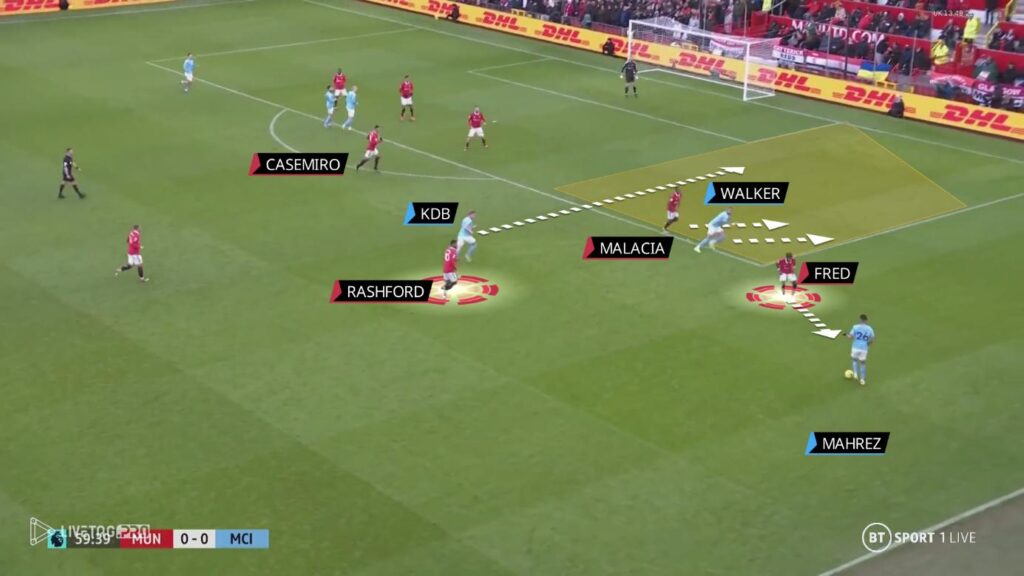 Odcinający środek Rashford zmuszał Walkera do gry w linię do Mahreza. Dzięki temu, że była to jedyna opcja do zagrania, Malacia mógł nastawić się na przecięcie podania poprzez wyprzedzenie. Istotną rolę pełniły w tej sytuacji dwie „szóstki” Czerwonych Diabłów, które asekurowały zwalniającą się przez to przestrzeń za plecami obrońców, którą atakował De Bruyne oraz Bernardo Silva.