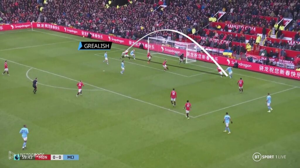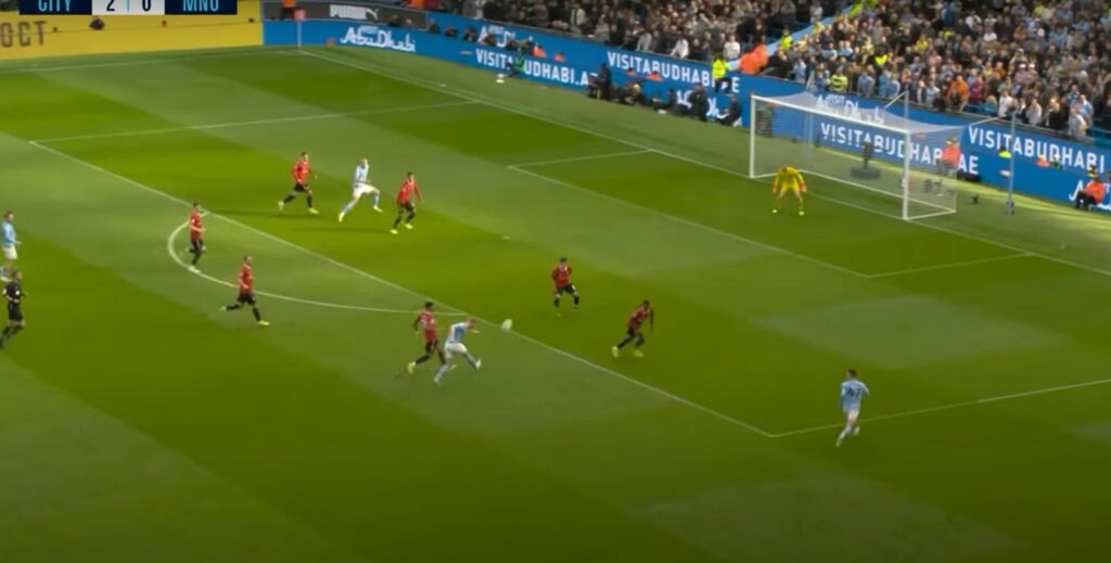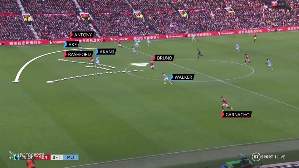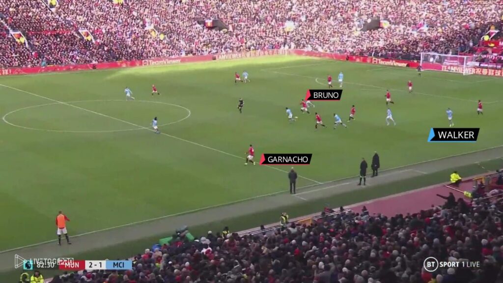Kilka minut po strzeleniu bramki Bruno Fernandes znów wykorzystał wolną przestrzeń i wysokie ustawienie Kyla Walkera w momencie straty piłki oraz braku odpowiedniej asekuracji, wyprowadzając kontratak podaniem do wbiegającego za linię obrony Garnacho.