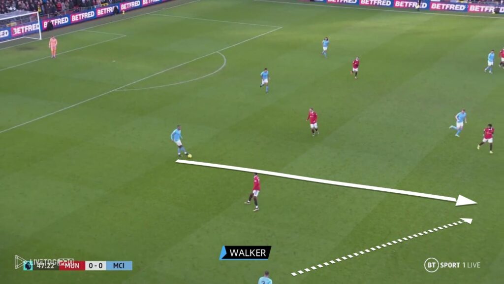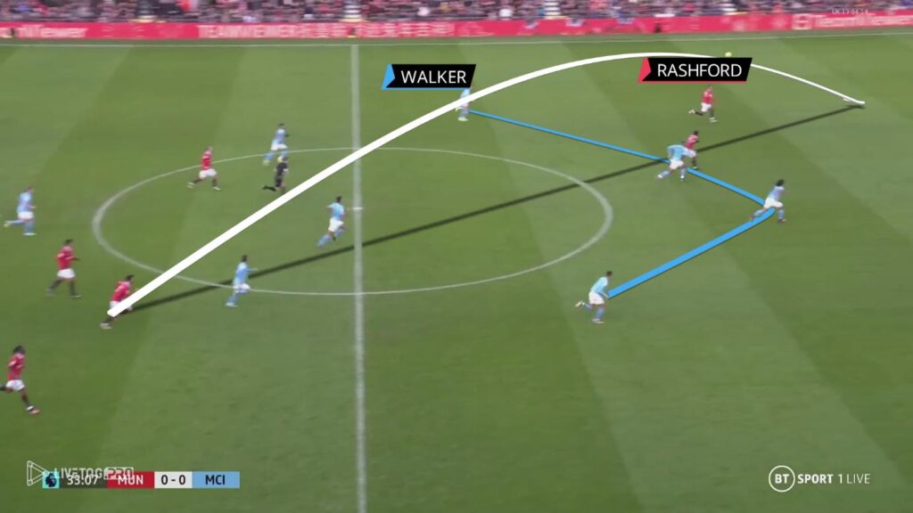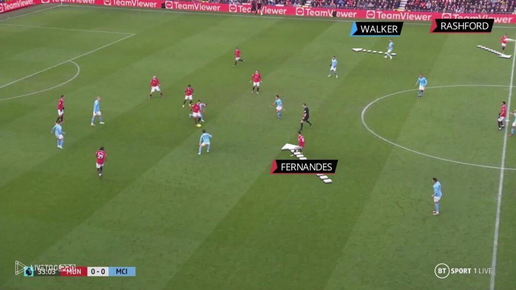 Włączanie się Walkera, było zarówno główną bronią Obywateli jak i szansą dla Czerwonych Diabłów na wykorzystanie przestrzeni za plecami. Po minięciu pierwszej linii pressingu Marcus Rashford często nie odpadał za włączającym się obrońcą, pozostając w gotowości do kontrataku. Obniżał i zawężał ustawiony wyjściowo po drugiej stronie Bruno Fernandes, stając się pierwszą opcją do podania po odbiorze piłki i zagrania jej możliwie jak najszybciej za plecy obrońców.