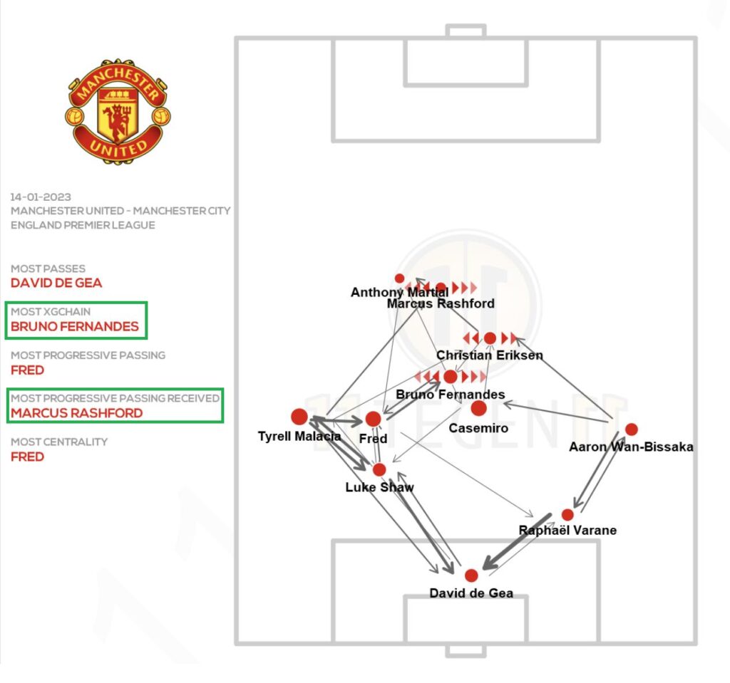 Zawodnikiem, do którego kierowano najwięcej podań zdobywających był Marcus Rashford, a tym który wykreował najwięcej szans strzeleckich Fernandes. Mimo gry na tych samych pozycjach i takich samych zadań w wysokim pressingu, można było zauważyć sporą asymetrię w działaniach w obronie niskiej oraz po odbiorze piłki. Dzięki zapędom ofensywnym Kyla Walkera, Cancelo często zostawał z tyłu do asekuracji, dzięki czemu Bruno poprzez zejście do środka mógł otrzymać piłkę i być głównym dystrybutorem w kontrataku, zwykle szukając ustawionego wyżej i wbiegającego za plecy Marcusa Rashforda.
