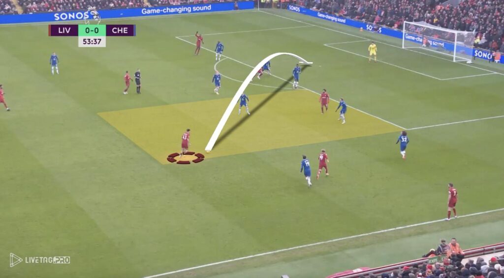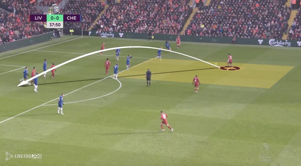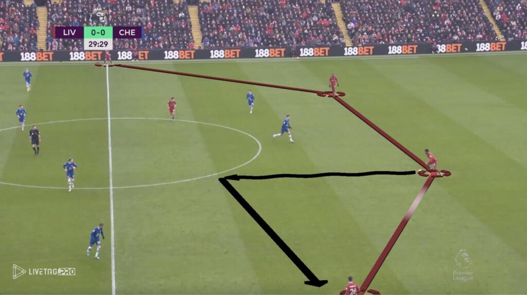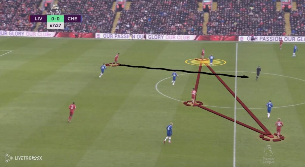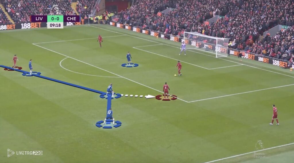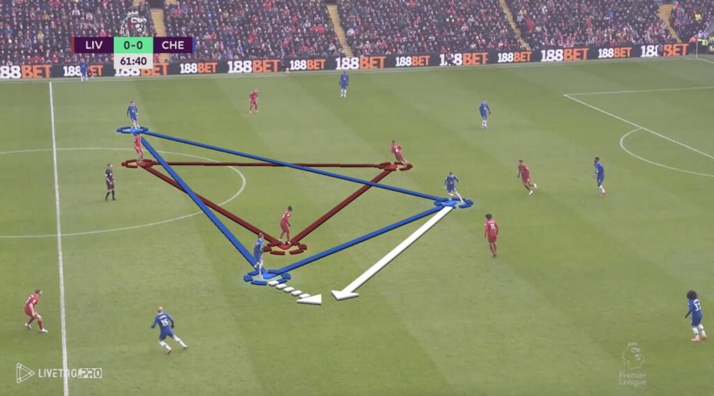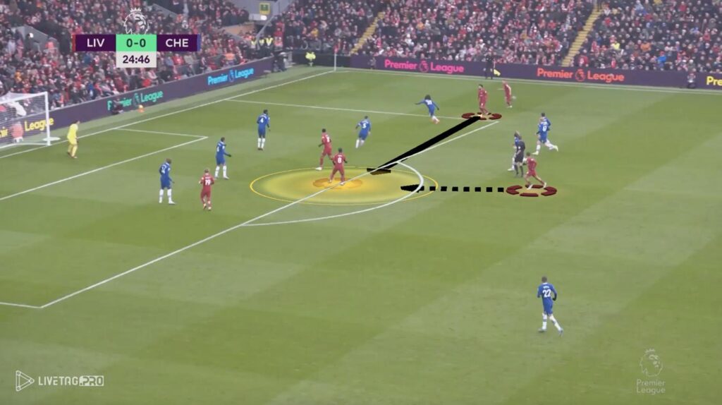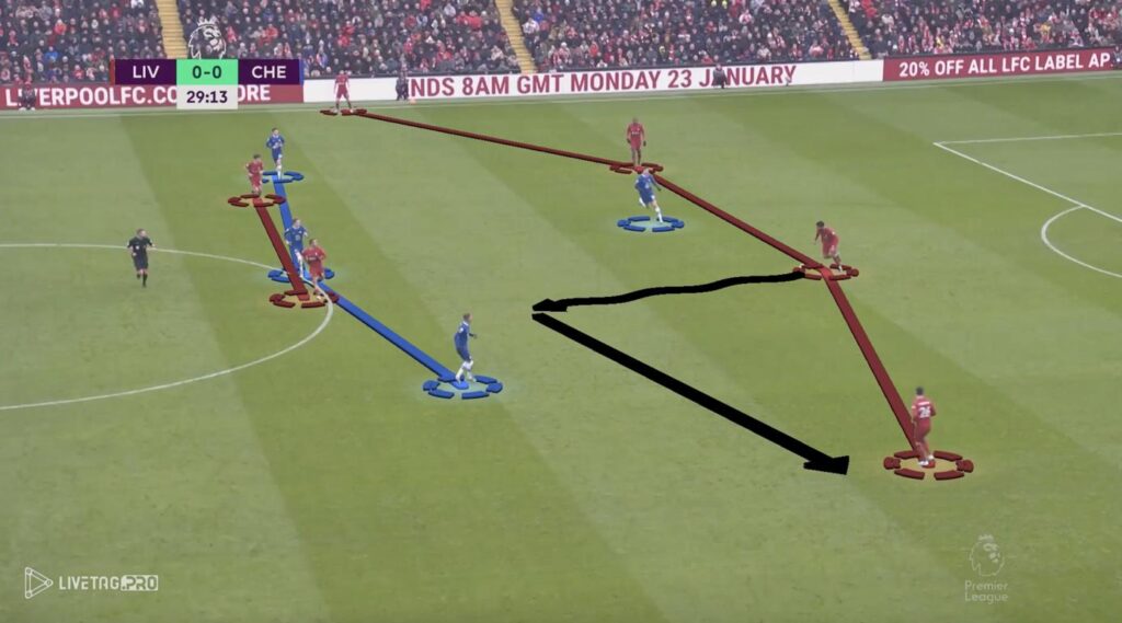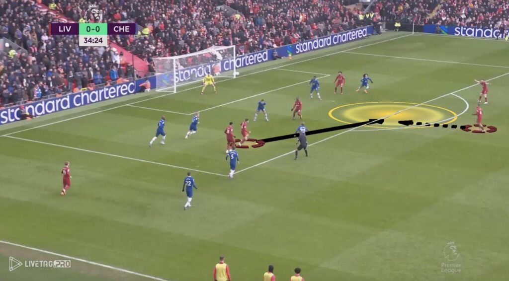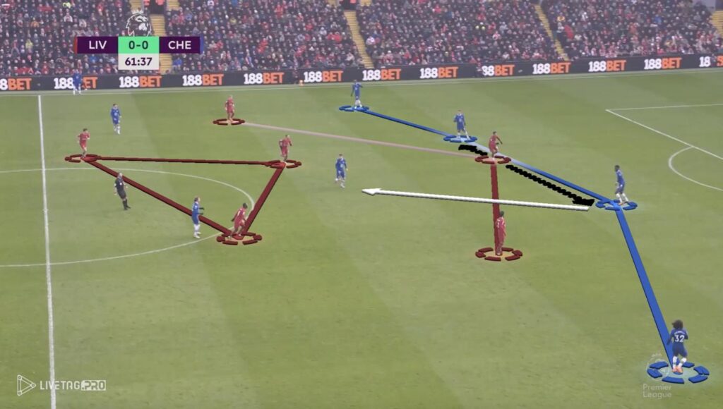 Podobna sytuacja. Wahadło daje wsparcie na na boku, bo podanie w tył aktywowało skok pressingowy Liverpoolu i Ziyech gra na trzeciego (włoska sztuczka) do wbiegającej 10, która ma 1v1.