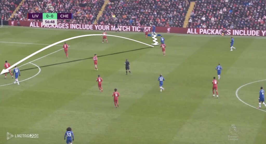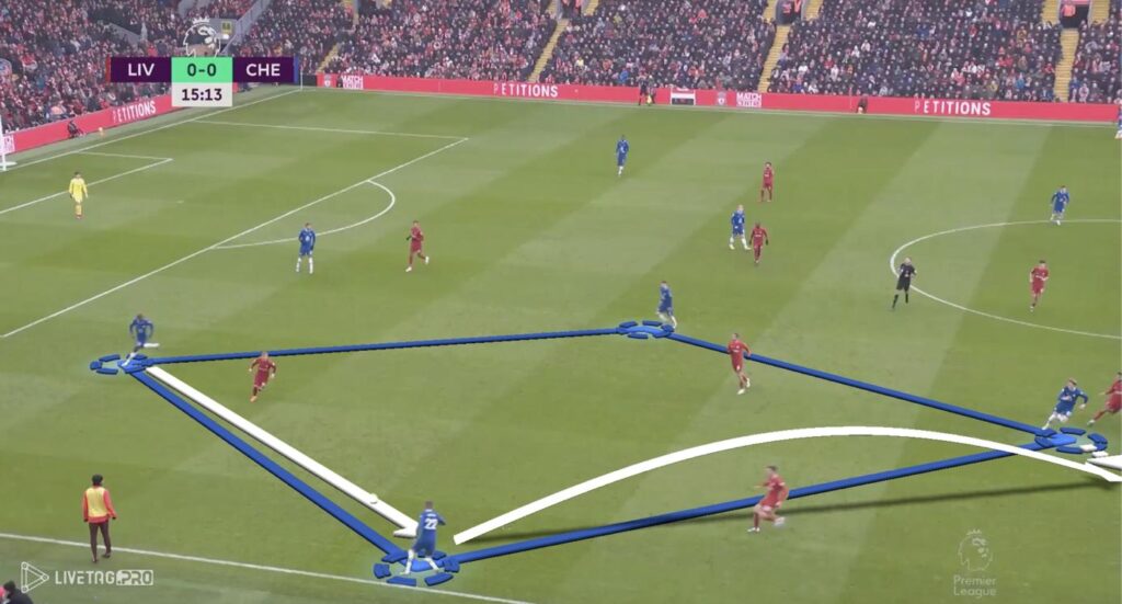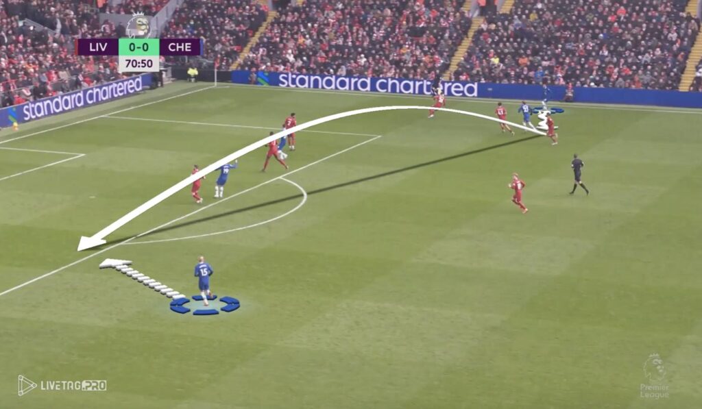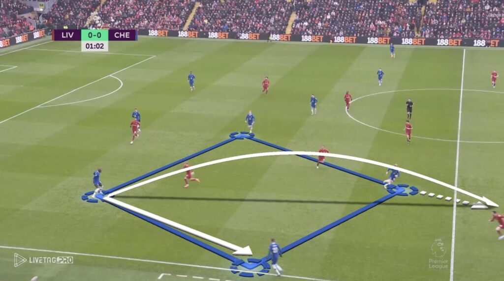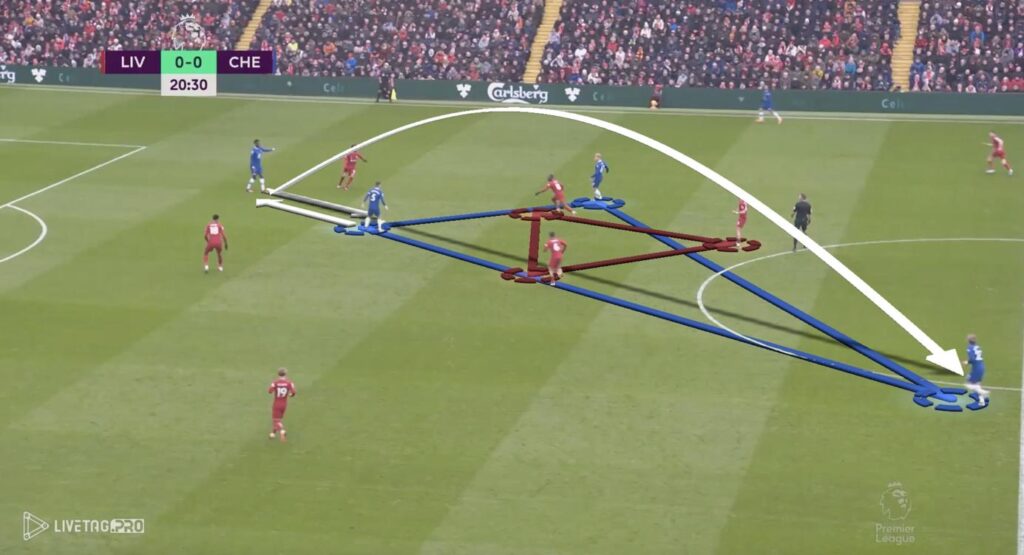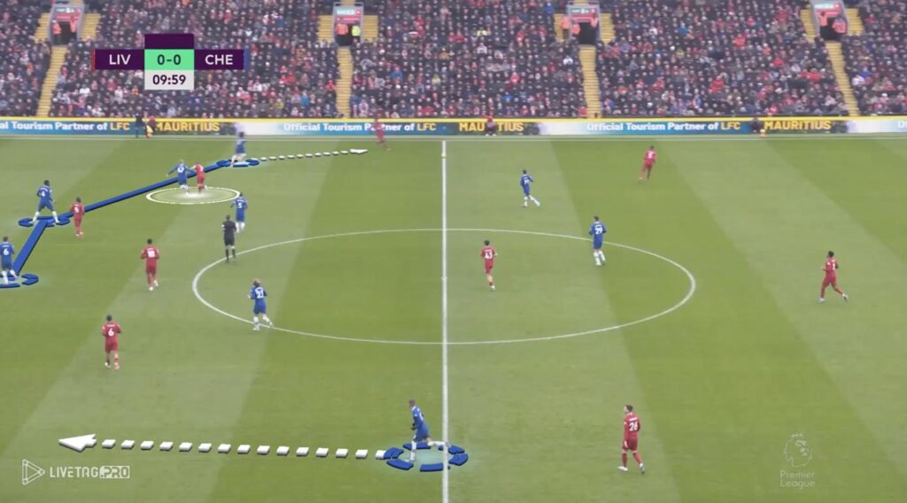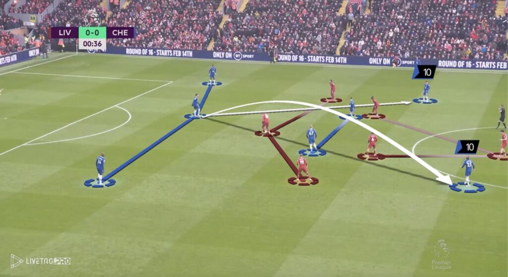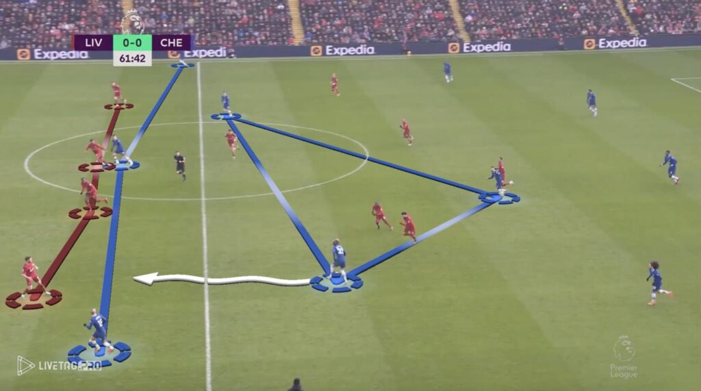 Nie zawsze trzeba grać szybko, aby dostać się pod bramkę przeciwnika. Chelsea budowała przez ŚO i 6, aby przyciągnąć jak najwięcej przeciwników i otworzyć przestrzeń za plecami pomocników.